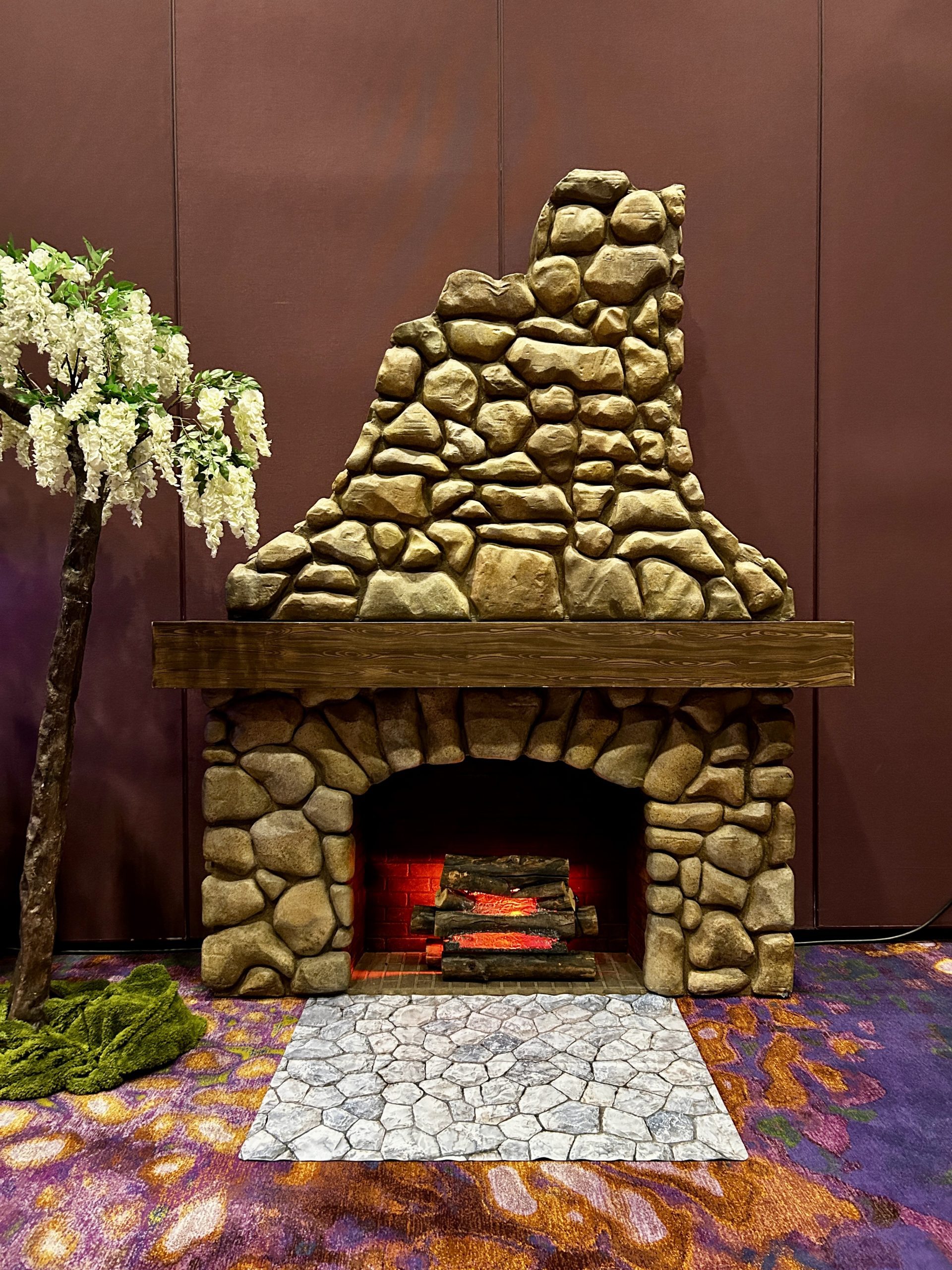 - Oversize faux stone fireplace with faux wood mantel